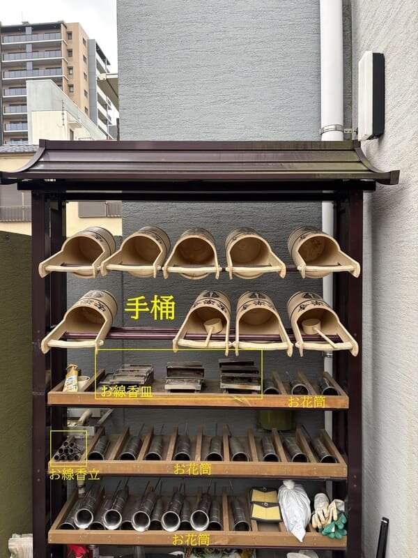 庭苑入口向かいの棚にございます共用の花立てとお線香立て、手桶をご利用ください。